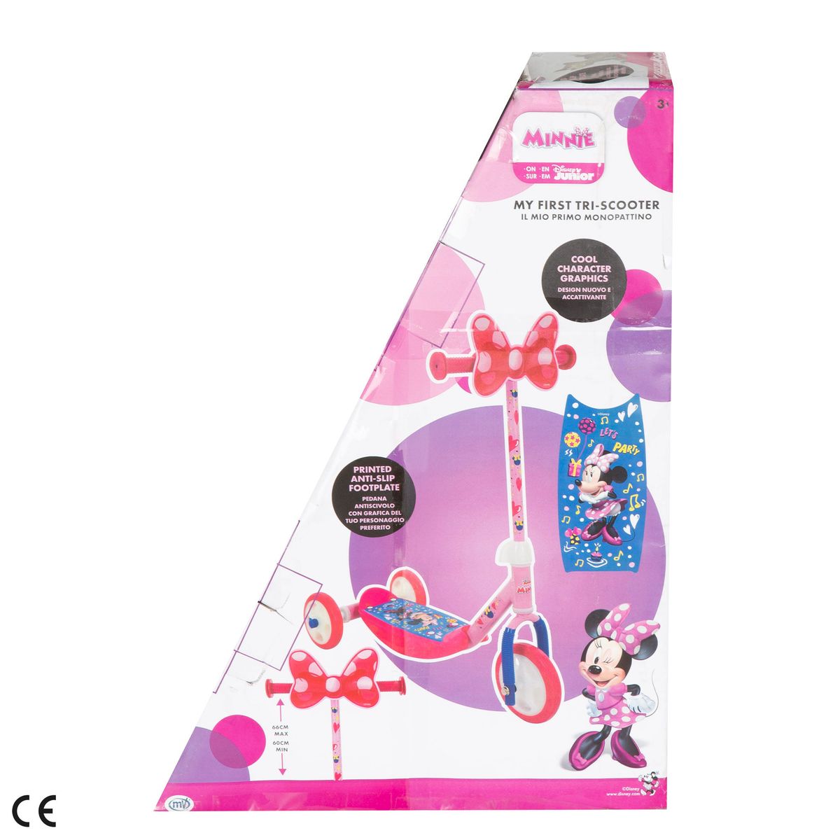 Disney Minnie Maus Roller mit rosa Schleife. Der Roller hat drei Räder: ein 15 cm großes Vorderrad und zwei 10 cm große Hinterräder aus pannensicherem EVA für mehr Fahrkomfort. Das rutschfeste Deck ist mit einem Bild der Disney-Figur Minnie Maus verziert. Der Lenker ist von 63 cm bis 69 cm höhenverstellbar, verfügt über zwei Gummigriffe für einen sicheren Halt und ist mit einer hübschen rosa Schleife als Frontplatte geschmückt. Maße: 59 x 36 x 69 cm. Empfohlen ab 3 Jahren. Maximale Tragkraft: 20 kg. Der Roller besteht aus einem stoßfesten Stahlrahmen und ist aus robusten Materialien gefertigt. Das verstärkte Deck erleichtert das Schieben und Balancieren und sorgt so für Komfort und Sicherheit.
