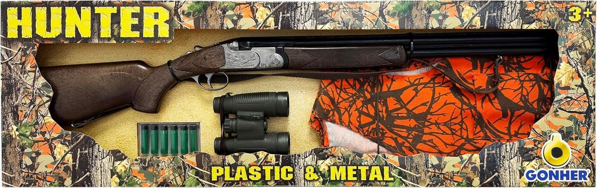Das Gonher Jagdgewehr-Set beinhaltet ein Jagdgewehr, ein Fernglas, eine Jagdtarnweste und sechs Patronen zum Einsetzen von Zündhütchen (nicht im Lieferumfang enthalten). Das Gewehr ist aus robustem Kunststoff und Metall gefertigt und hat eine Länge von 80 cm.