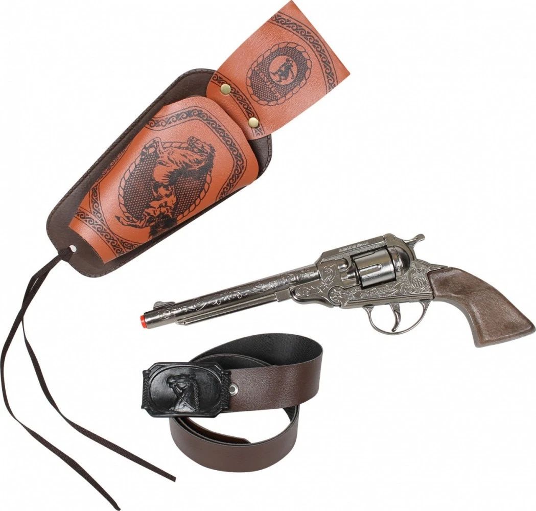 Gonher Texas Cowboy Pistolen-Set, bestehend aus: Western-Cowboypistole, Pistolenholster und Cowboygürtel. Hergestellt aus hochwertigem Metall in Spanien. Verwendet 8-Schuss-Zündhütchen (nicht im Lieferumfang enthalten). Entspricht allen EU-Vorschriften.