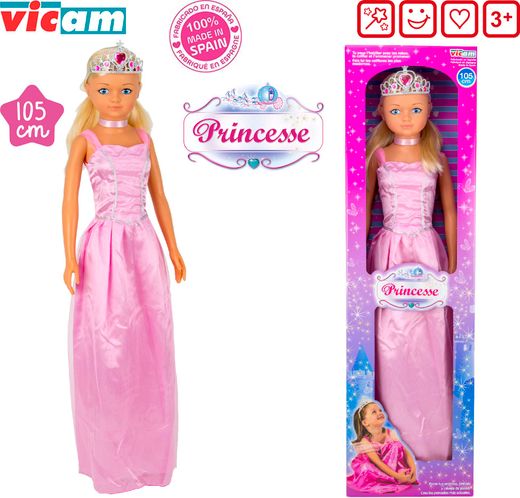 Vicam Prinzessinnenpuppe, 105 cm. Die Puppe ist 105 cm groß. Kopf, Arme und Beine sind beweglich, sodass sie stehen und sitzen kann. Ihr langes, blondes Haar lässt sich bürsten und auf verschiedene Arten stylen, zum Beispiel zu Pferdeschwanz, Zopf oder originellen Prinzessinnenfrisuren.